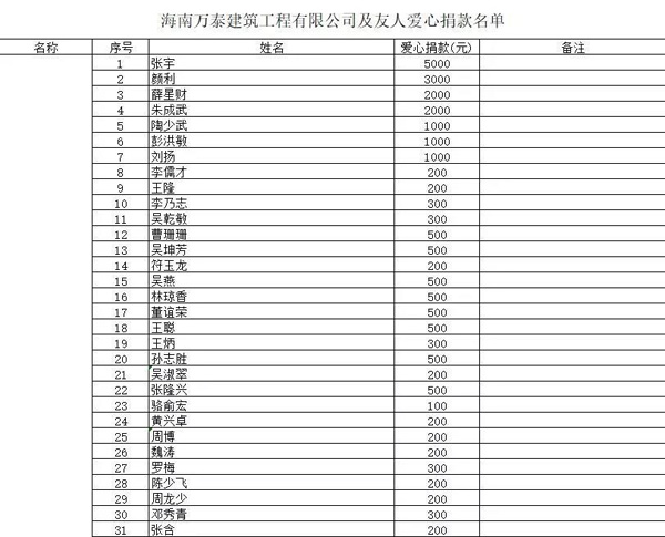 1月28日,我們在海南萬泰建筑公眾號發布了海南萬泰公司張小龍總經理和海口市老年人福利院項目負責人林莉共同出資5萬元購買5000個N95口罩及飛利浦G31E病人監護儀1套捐贈給武穴市及張小龍總經理組織同胞募捐的文章《心系荊楚,共渡難關,這場戰“疫”,海南萬泰在行動!》,在公司引起了極大反響,大家主動問詢如何捐款為湖北疫情盡一份力,大家的一腔熱血和愛心令人動容,由此,我們迅速成立萬泰籌募組,在公司內部展開了愛心捐款。愛心捐款行動一呼百應,在短短不到兩天的時間里,萬泰募捐組就收到了來自公司員工,萬泰各地項目部及公司的合作友人的支持。截止目前,萬泰籌募組已籌得284380元的善款!這些善款,我們已全部捐贈給武穴市梅川鎮政府用于抗擊湖北疫情。捐款情況已向海南省湖北商會,武穴市工商聯,武穴市統戰部匯報。后續我們將跟蹤款項用途。