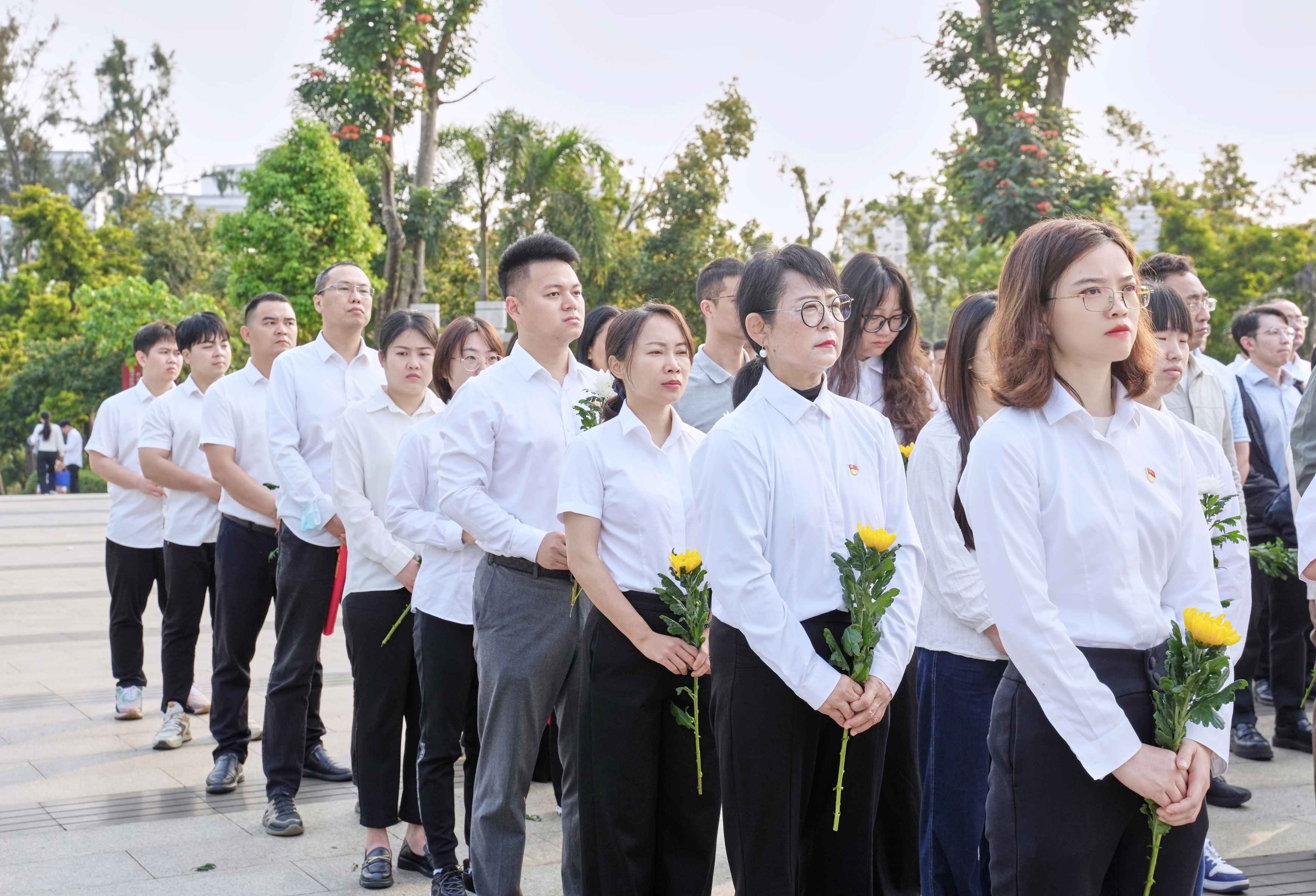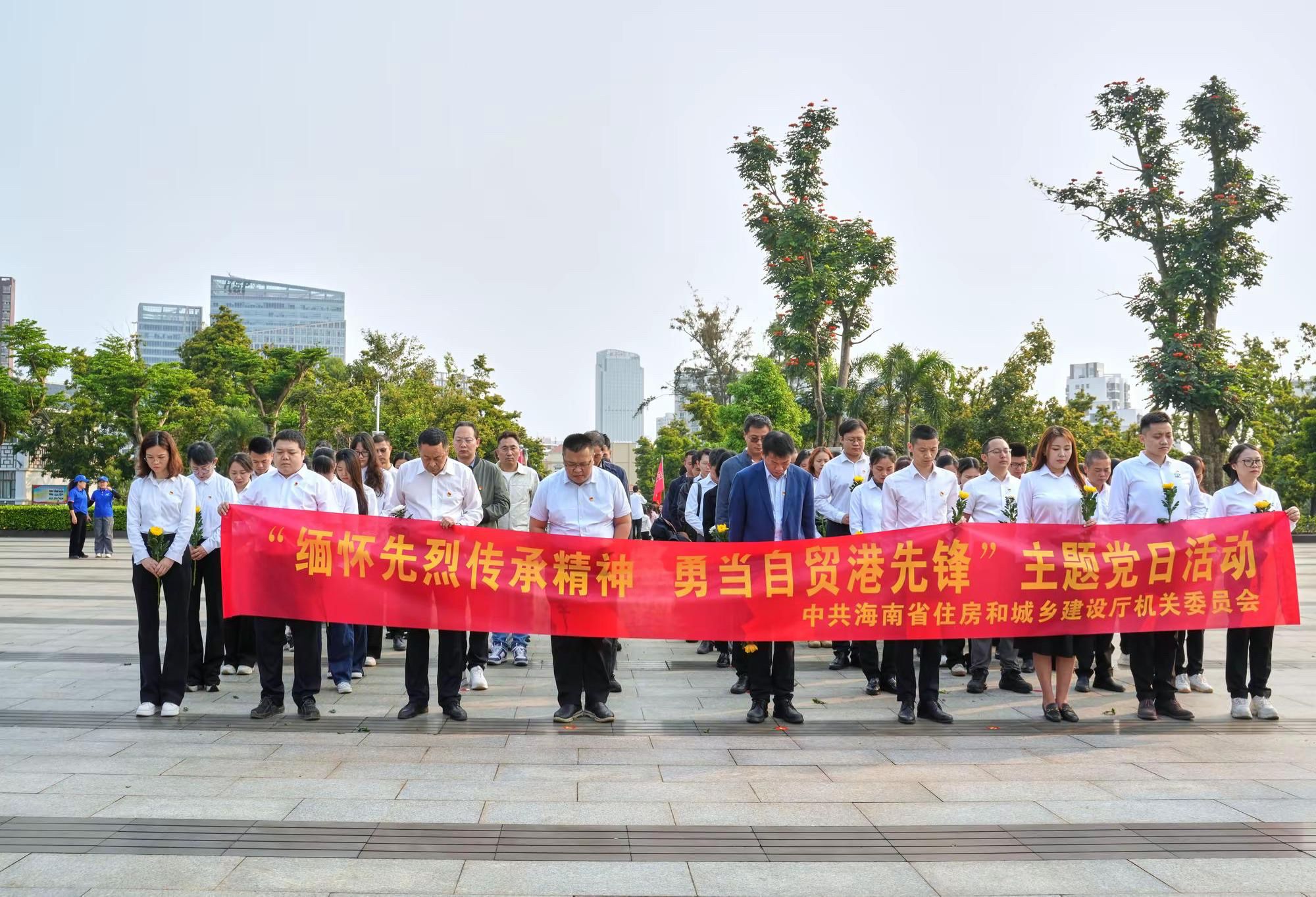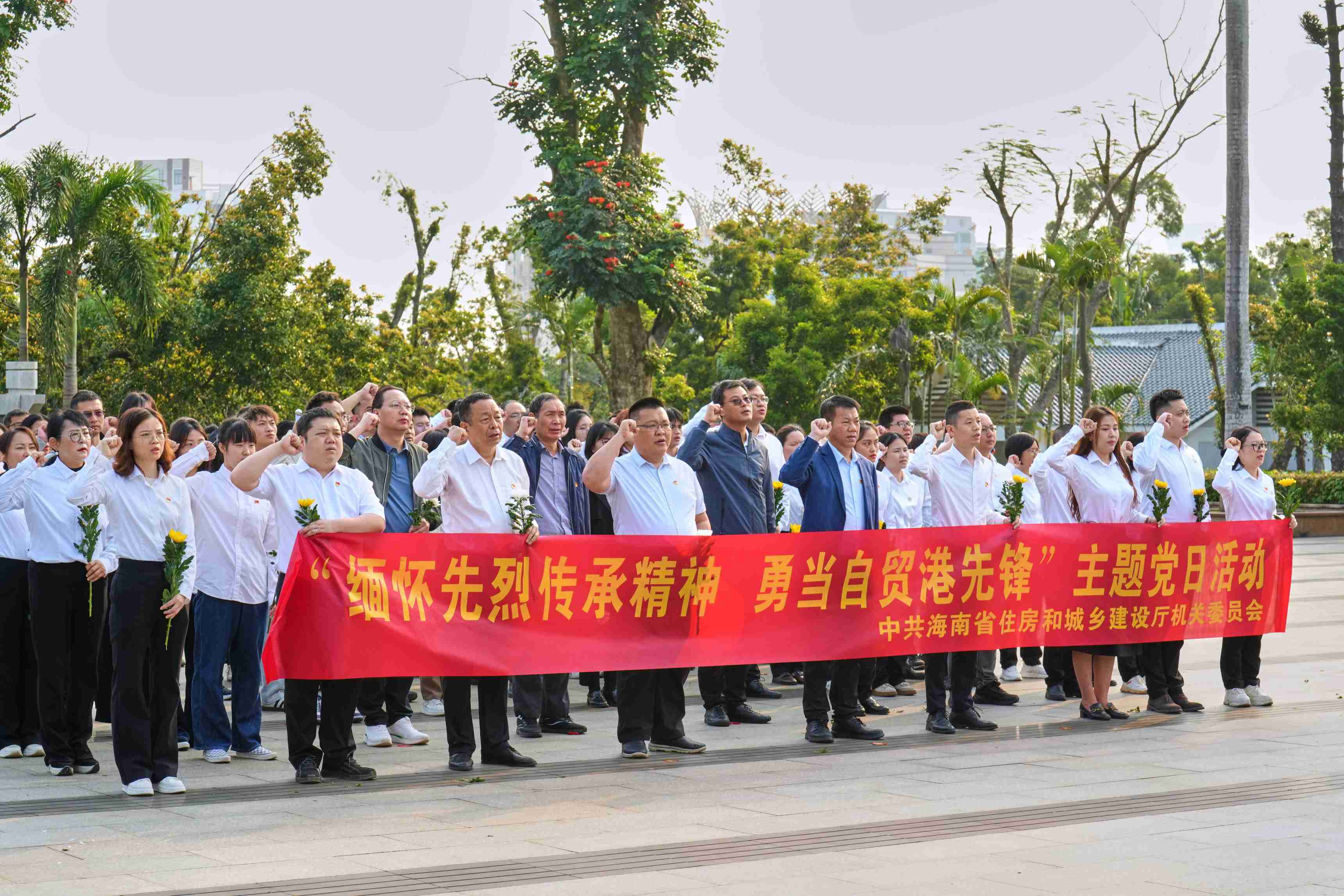 上午8時,來自省住建廳相關處室以及建筑行業相關基層黨組織,共90余名黨員、入黨積極分子齊聚海口市解放海南島戰役烈士陵園。大家身著統一淺色上衣、深色下裝,佩戴黨徽,整齊列隊,在莊嚴肅穆的烈士紀念碑前肅立。